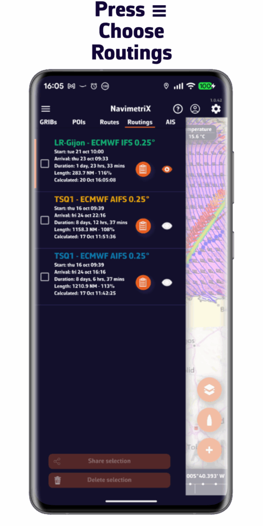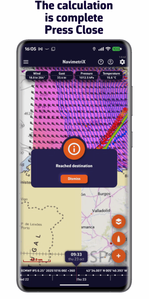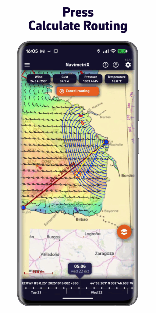 - If a routing is displayed, the boat moves at the selected time along its trajectory.