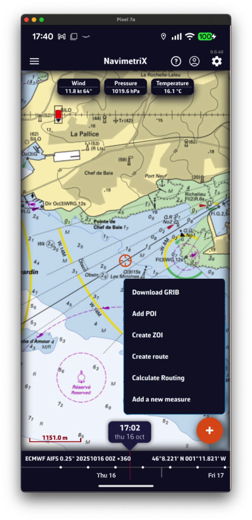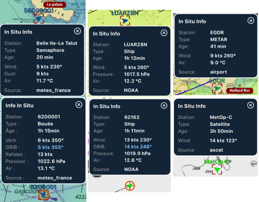 If the time of the information falls within the coverage period of the GRIB file displayed, then tapping/clicking in the center of the popup centers the chart on the station’s coordinates and returns the timeline to the exact time of the station, allowing you to compare the data value and the GRIB file forecast.