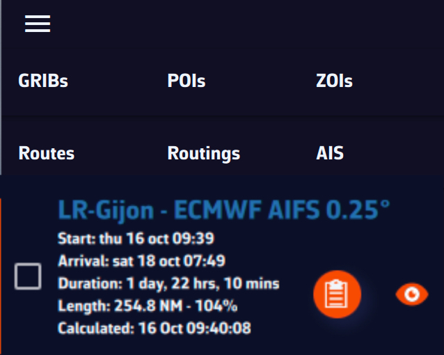 Downloaded GRIB files appear in the GRIB list on all devices. When a GRIB is downloaded or updated on a device, it is followed by a dimmed refresh icon. If a new run is available for that GRIB, this icon is activated.