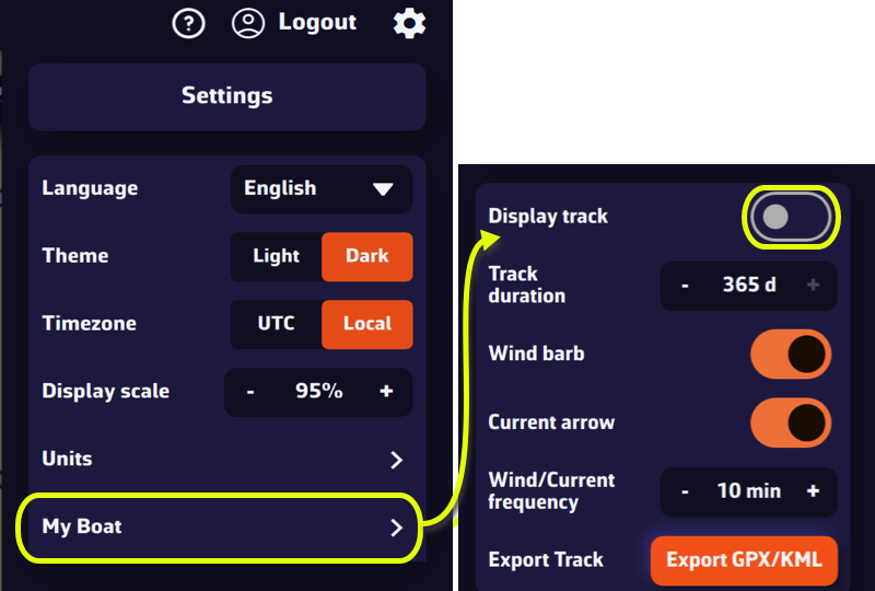 Open the app settings ⚙︎ and select ‘My boat’. The track settings are at the bottom of the list.
