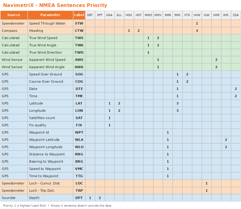 NavimetriX receives navigation data from your instruments via NMEA 0183 sentences. When multiple sentences can provide the same parameter, the app uses the highest-priority source available (1 = first choice). If that sentence isn’t received, it falls back to the next priority.