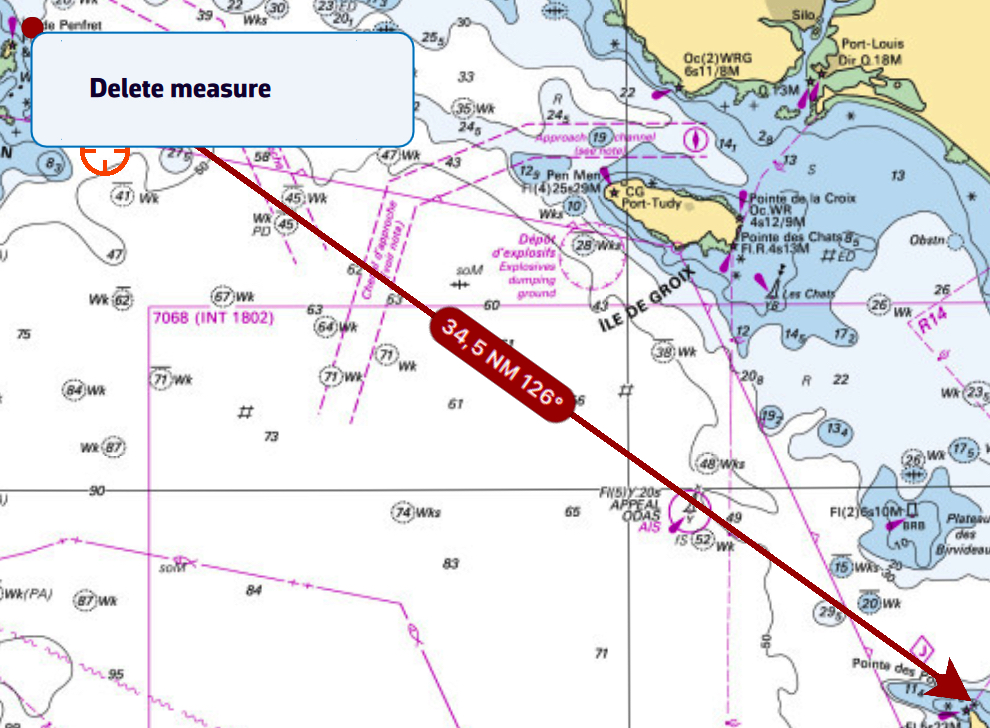 Using the action button, you can perform several measurements on the chart. Select ‘Add a new measure’ then move the endpoints. The vector displays the distance and true bearing.