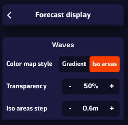 In the "Waves" section, select the Iso zones colour style, which represents wave height data as isopleth bands of equal height, using rainbow colours from blue (calm sea) to magenta-red (rough to very rough sea), passing through various shades of green, yellow, orange and red. Particularly well suited for wave data.