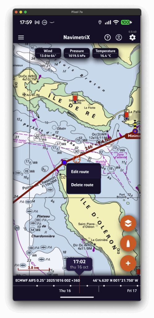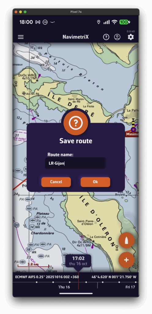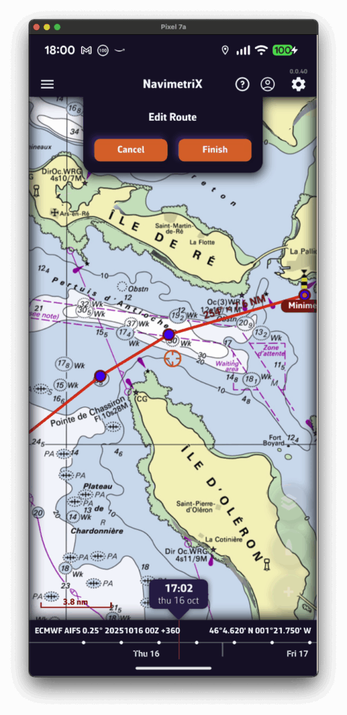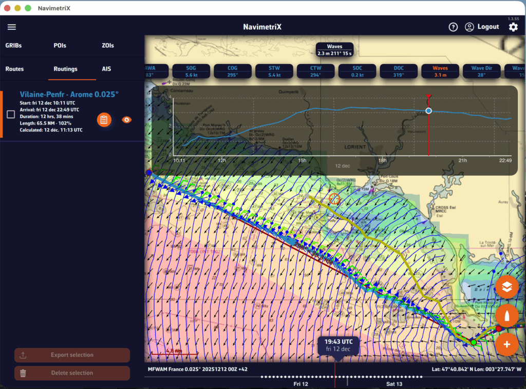- Si se muestra un routing, el barco se desplaza a la hora seleccionada a lo largo de su trayectoria.