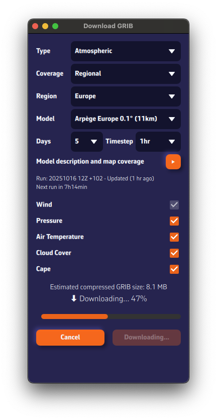- Muestra todas las horas cubiertas por el archivo GRIB cargado actualmente.