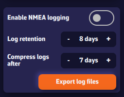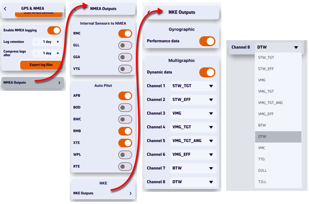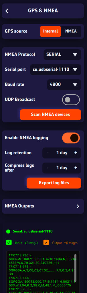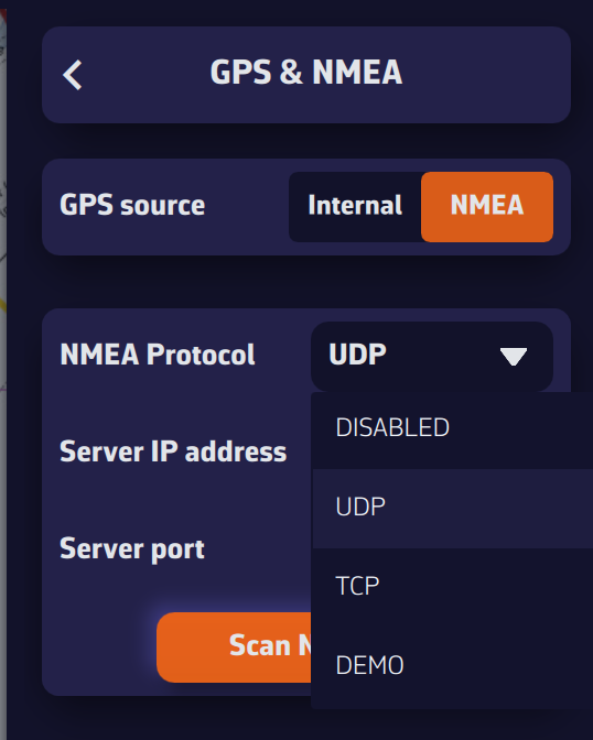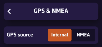 Abra los Ajustes tocando el icono del engranaje y seleccione GPS & NMEA. Una vez conectado y con la transmisión de datos activada, seleccione: