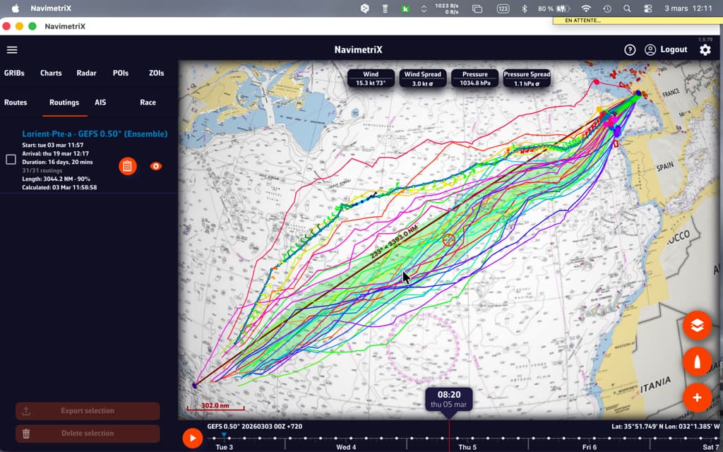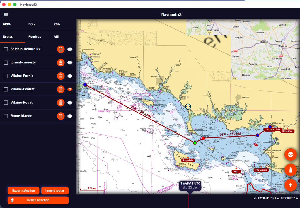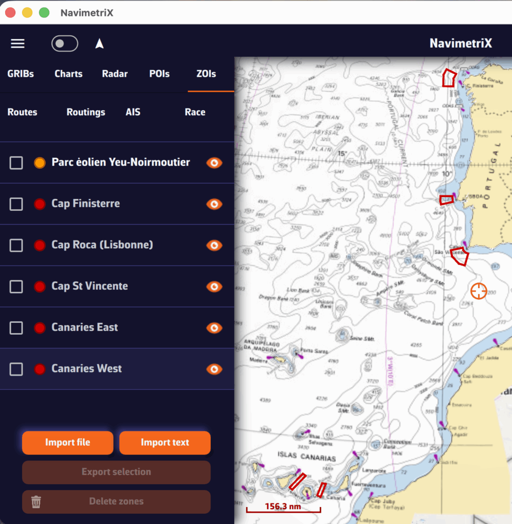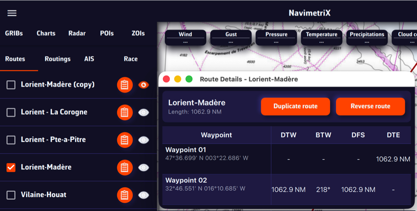 El Race Tracking le permite seguir regatas de vela de altura en tiempo real directamente en la carta de NavimetriX. Puede importar definiciones de regatas, descargar informes de posición automática o manualmente, y ver clasificaciones basadas en la distancia a la meta.