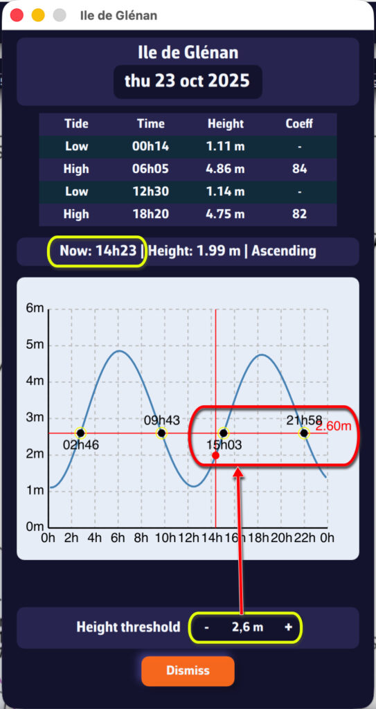 - Verde: marea alta. Al hacer clic en un icono se abren los detalles de la marea con las horas y alturas calculadas directamente en la aplicación.