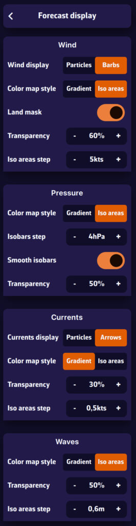 - Permite elegir qué parámetros meteorológicos mostrar: