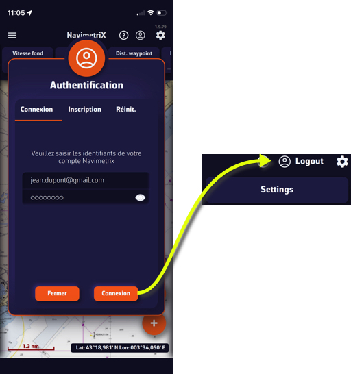 - 👤Icono de Cuenta: permite iniciar sesión en su cuenta de NavimetriX, crear una cuenta o restablecer su contraseña.