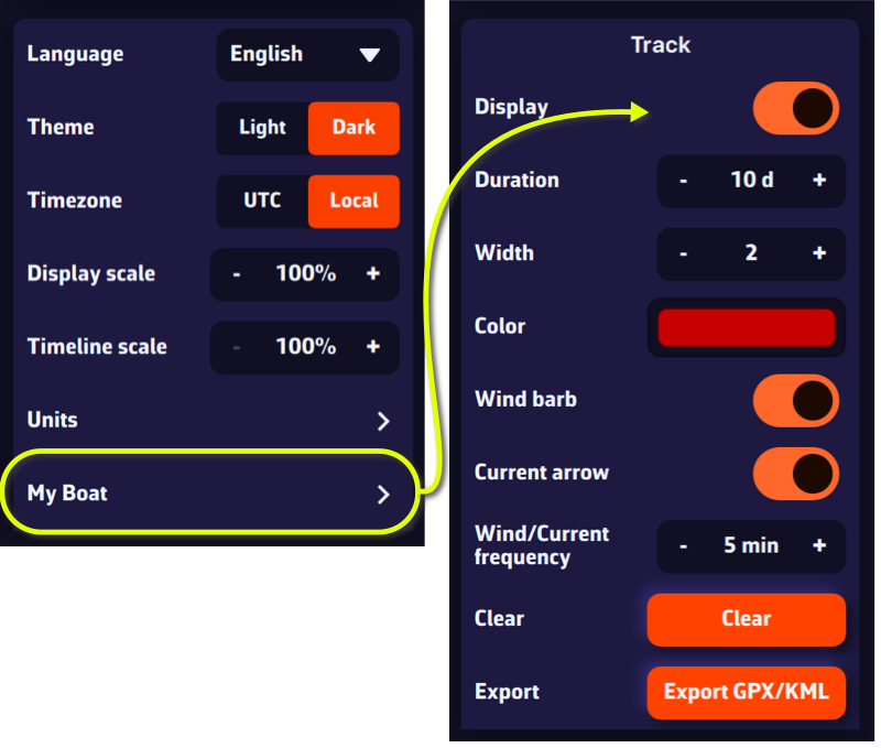- Active la visibilidad de barcos individuales o use Mostrar todos / Ocultar todos