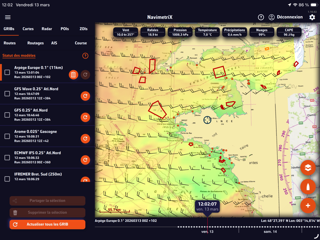 Les fichiers GRIBs téléchargés apparaissent dans la liste des GRIBs sur tous les appareils. Quand un GRIB est téléchargé ou actualisé sur un appareil, il est suivi d’une icône d’actualisation (rafraîchissement) estompée. Si un nouveau run est disponible pour ce GRIB, l’icône est activée.
