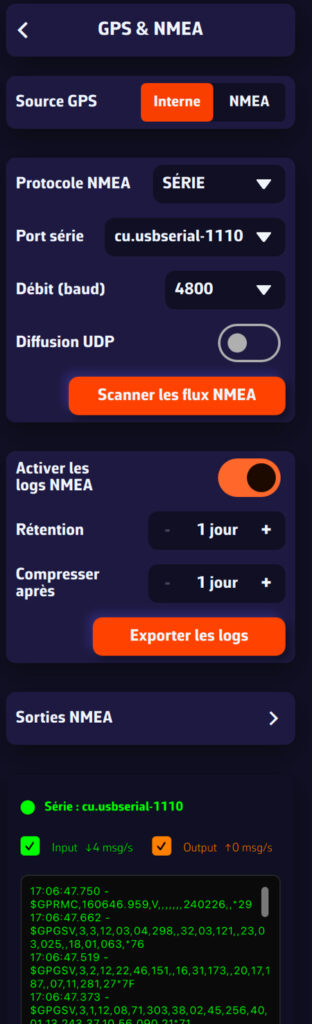 Le dernier pavé permet d’activer les logs NMEA. Si vous l’activez, toutes les trames reçues seront enregistrées. Vous pouvez définir la rétention (par exemple 8 jours) et choisir après combien de jours elles seront compressées. Les fichiers journaliers non compressés peuvent être volumineux (typiquement 60 Mo), une fois compressés, il feront environ 10% de leur taille initiale.