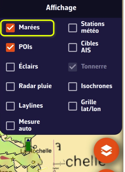 Vous pouvez afficher plusieurs types d’icônes sur la carte : les cibles AIS, les balises d’aide à la navigation (NavAids), les balises de détresse SART (Search And Rescue), les cibles AIS par Internet (1er trimestre 2026), les stations de données météo “in-situ”.