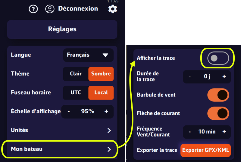 Ouvrez les réglages de l’application ⚙︎ et sélectionnez “Mon bateau”. Les réglages de la trace sont en bas de la liste.