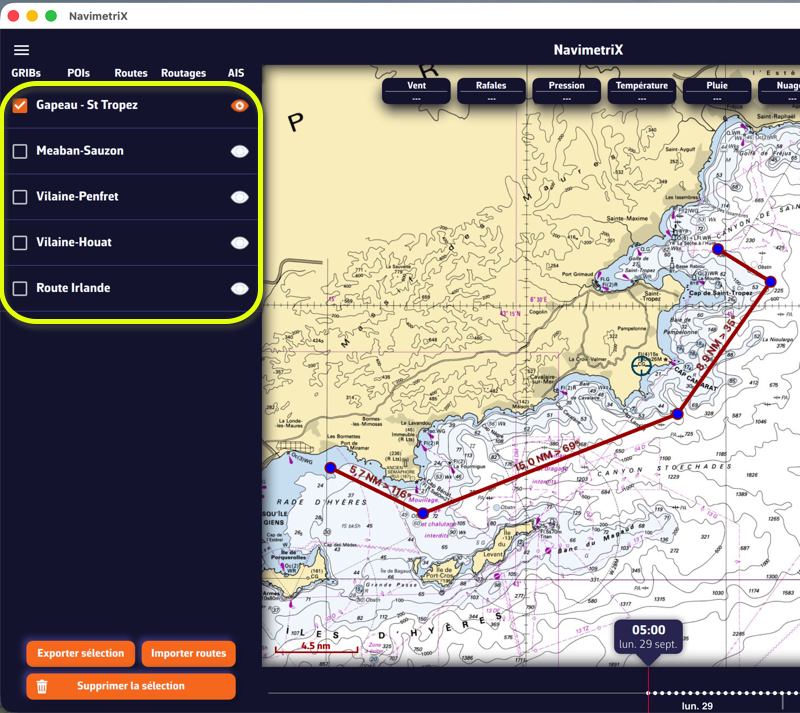 Un tap sur l’oeil en face de chaque route permet d’activer/désactiver son affichage. Une coche dans les cases devant chaque route permet de les sélectionner pour les fonctions exportation et suppression.