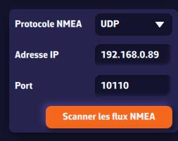 Si le scan ne trouve rien, saisissez manuellement les paramètres de votre centrale NMEA. Préférez le protocole UDP pour plus de flexibilité.