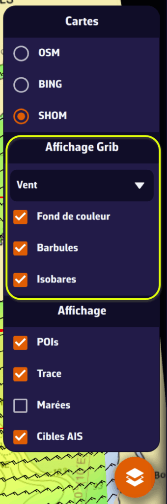 Dans la section Affichage GRIB, le menu déroulant permet de sélectionner une donnée à afficher. Si vous avez affiché un GRIB météo à l’écran (par exemple un modèle IFS), la donnée Vent sera sélectionnée par défaut. Vous pourrez cocher/décocher l’affichage du fond de couleur, des particules ou des barbules selon votre réglage précédent (voir ci-dessus), des isobares (lignes d’égale pression atmosphérique).