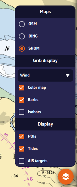 In the GRIB Display section, the drop-down menu allows you to select which data to display. If a weather GRIB (for example an IFS model) is displayed, Wind will be selected by default. You can enable or disable the color background, particles or barbs (according to your previous setting above), and isobars (lines of equal atmospheric pressure).