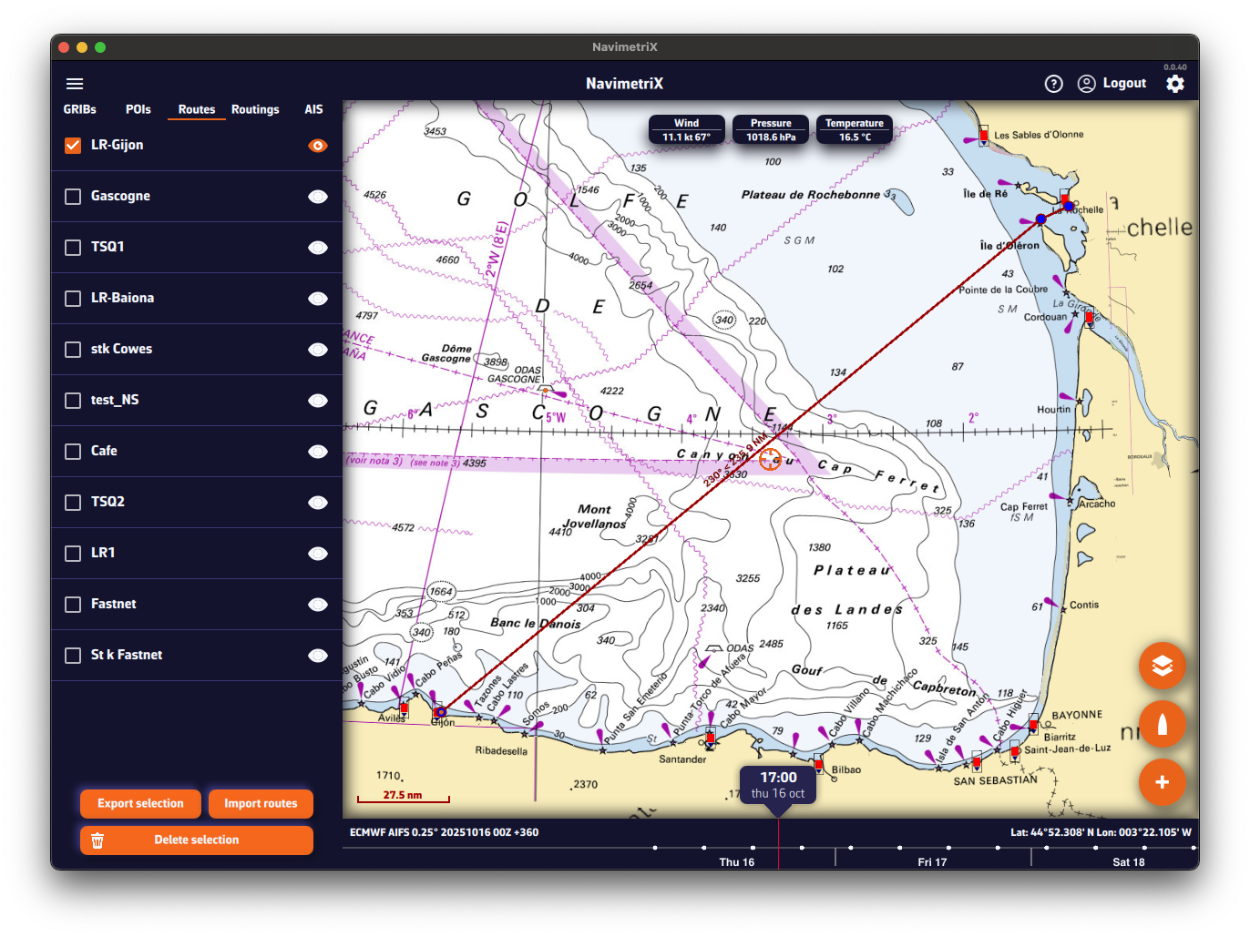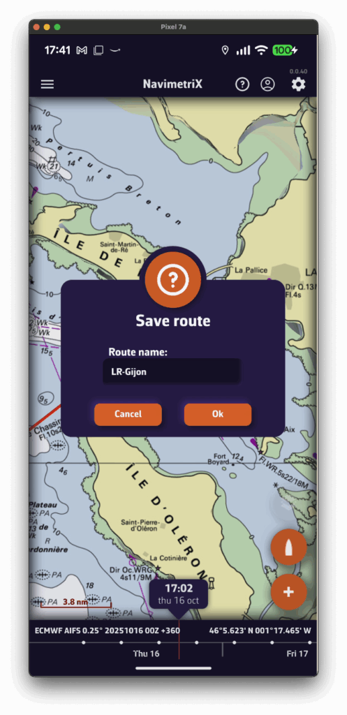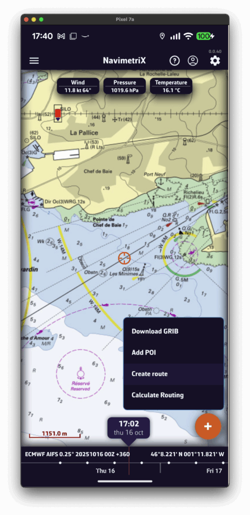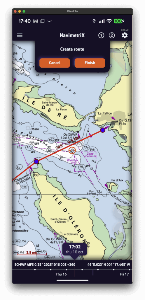 Move the chart under the target displayed on the screen, zooming in for precise positioning, then tap the + icon in the lower right corner. From the menu, select “Create a route”.