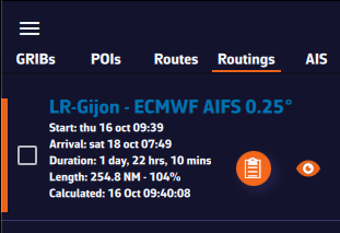 Open the lists panel (via the ☰ button at the top left of the screen) and select the Routing tab. This tab lists all computed routings.
