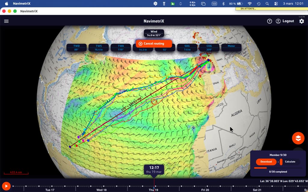 Ensemble routing in NavimetriX transforms an analysis that was traditionally reserved for experts into a visual and intuitive tool. With a single click, you can switch from a single forecast to a comprehensive view of all possible options, allowing you to navigate with confidence, even when the weather is not.