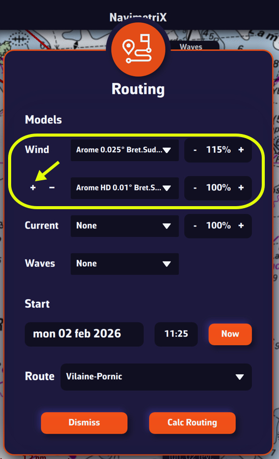 Tapping/clicking on the small + button under the word “Wind” opens a second drop-down menu allowing you to choose one (or more) additional model(s).